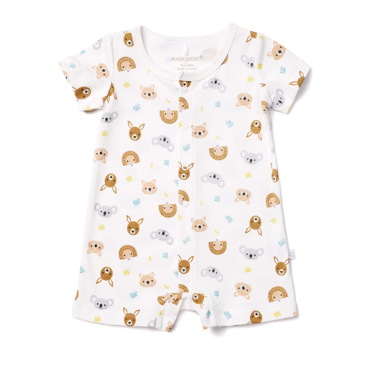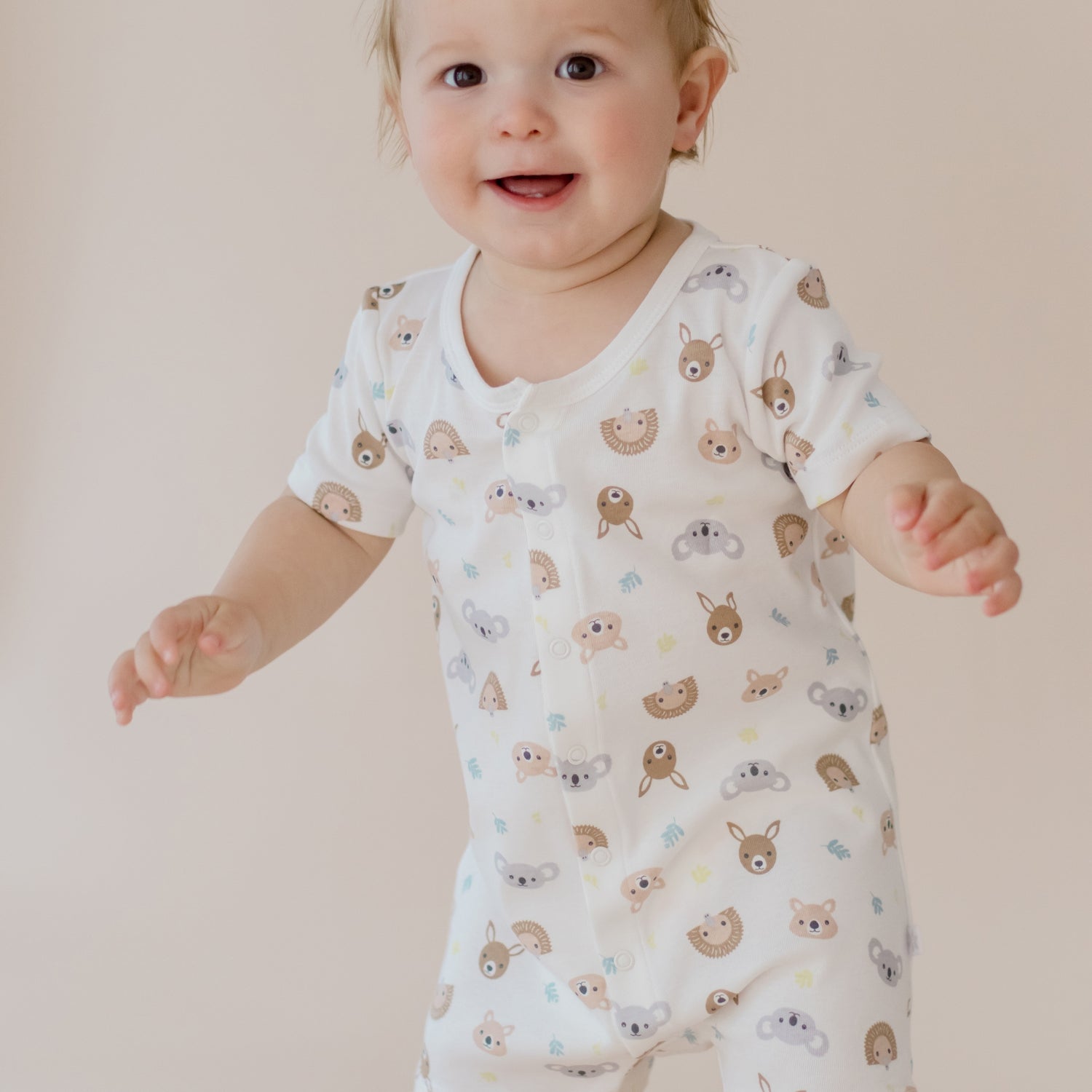 Dress your baby in Australian charm with this short sleeve romper featuring an all-over Australiana print - complete with koalas, wombat, kangaroos, and echidnas. Made from 100% soft cotton, it’s breathable, gentle on skin, and perfect for warm days. The front press studs make dressing and changes a breeze, combining comfort with everyday convenience.