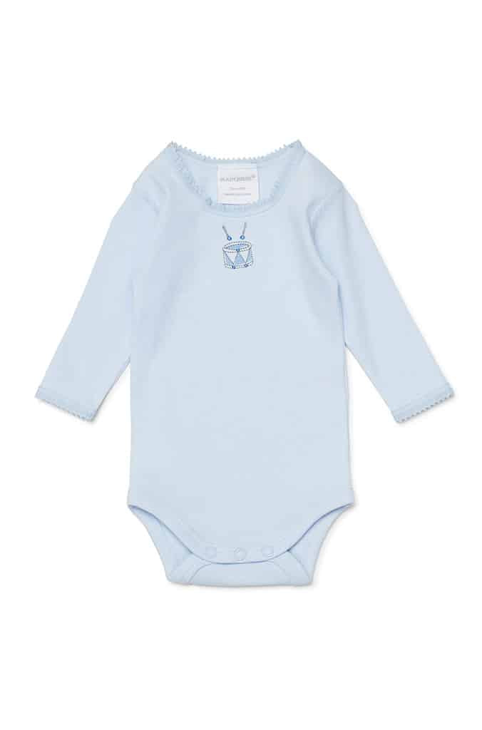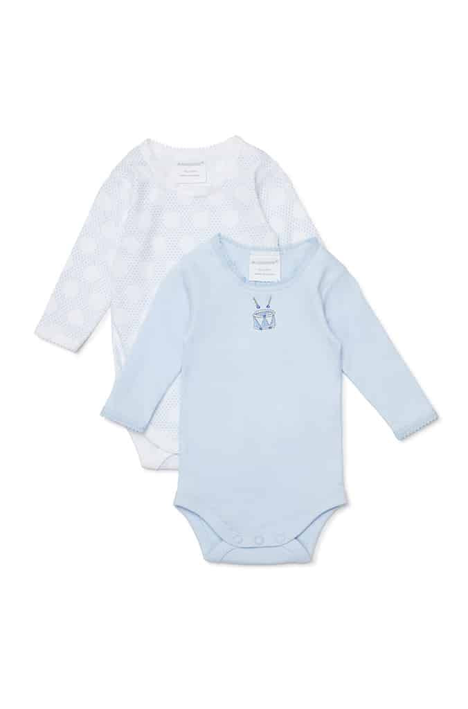 - Design: 1 x blue with drum print/embroidery. 1 x blue and white dotted print