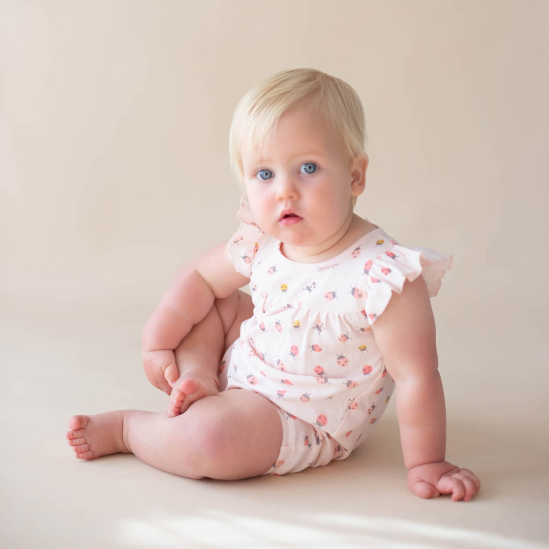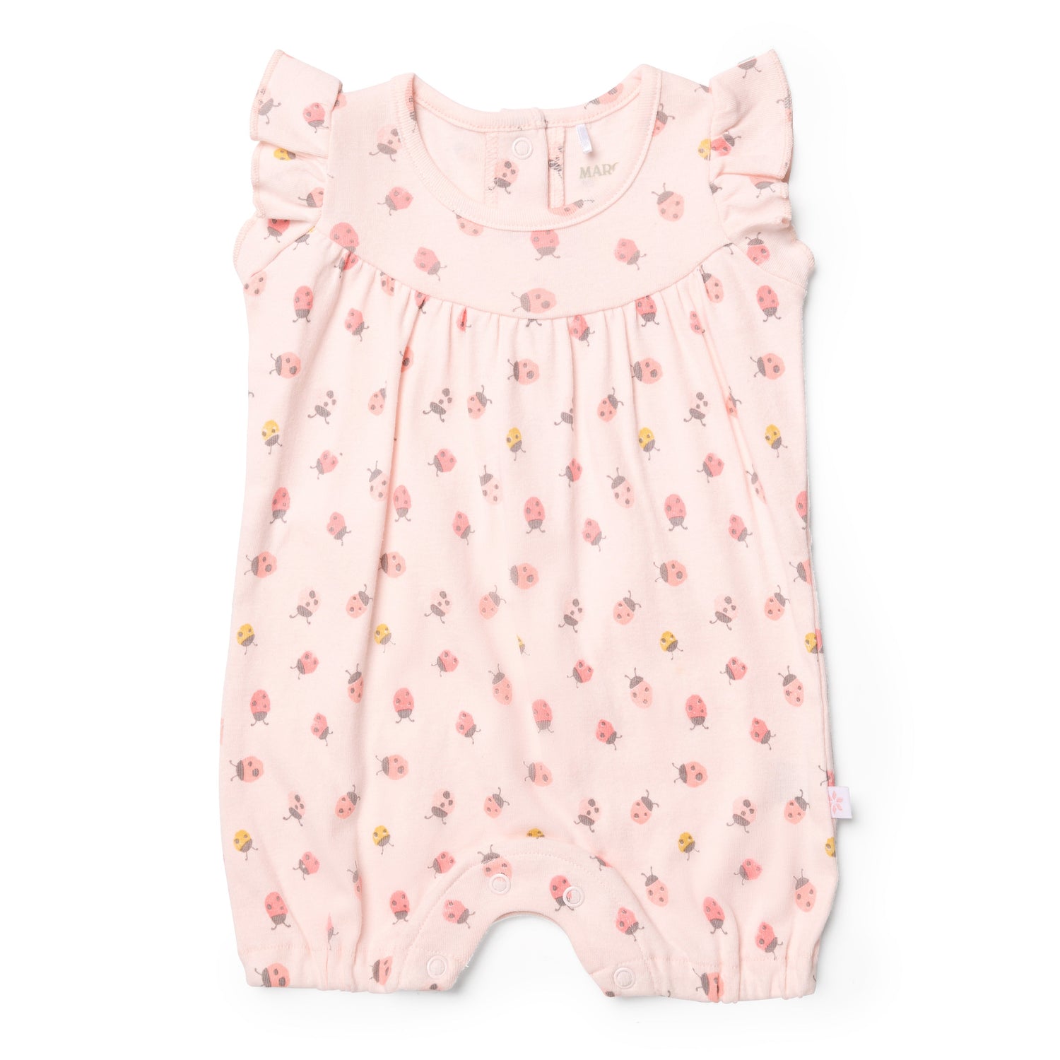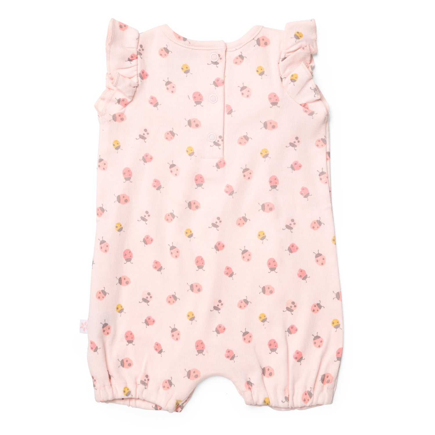 Sweet girls romper with frill sleeve detail and all-over ladybug print on a soft pink base. Made from our premium cotton, this is the prettiest all-in-one to keep your little girl cool and comfy this summer.