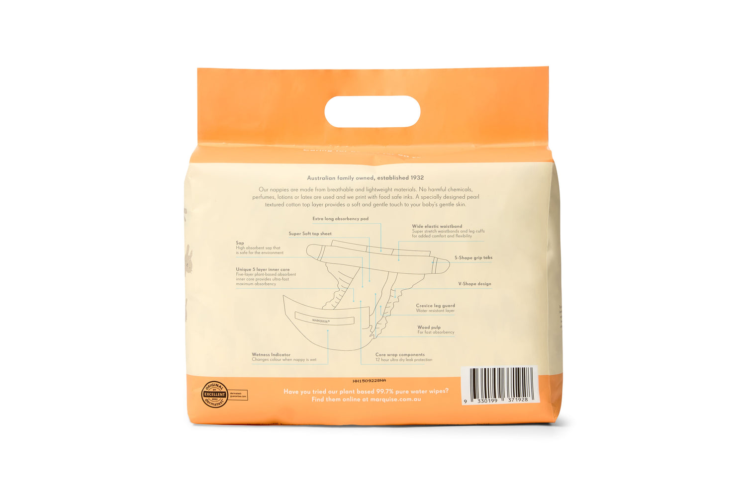 Our Hypoallergenic Nappies have you protected from messy leaks and blow-outs for 12 hours (hello full night's sleep!). They are chemical-free, dermatologically tested and made with 73% plant based materials.