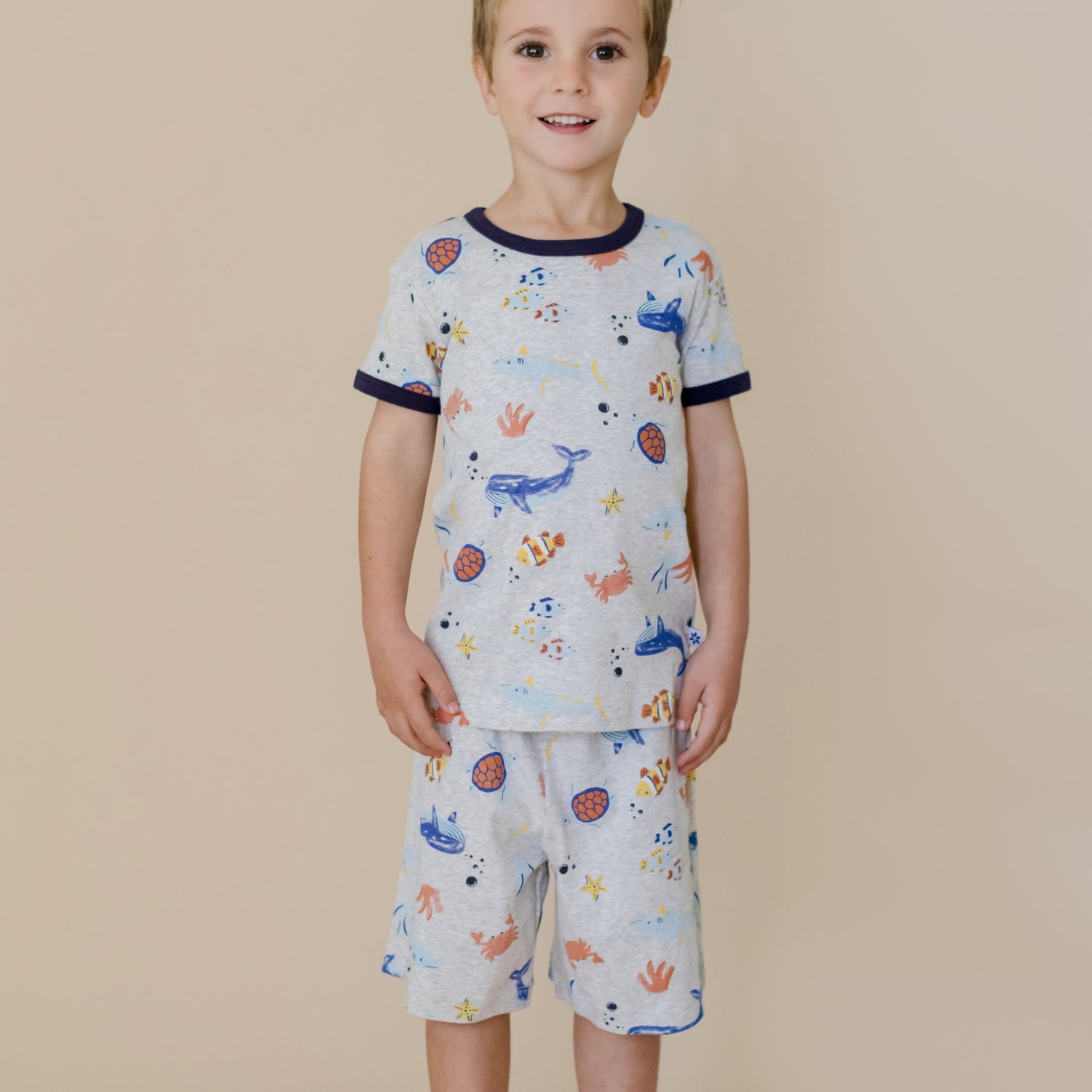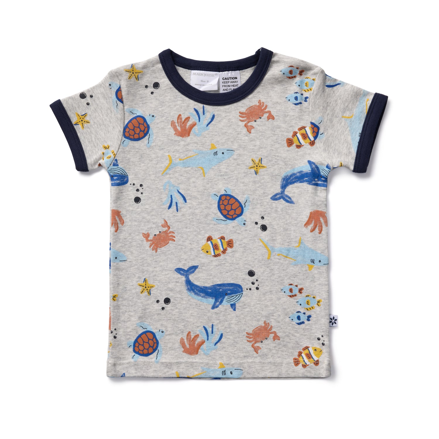 Dive into bedtime with this cool ocean-inspired pyjama set! Featuring an all-over sea life print with whales, crabs, and sharks, this soft grey melange set brings a splash of fun to summer nights. Made from 100% cotton for breathable comfort and easy, everyday wear.
