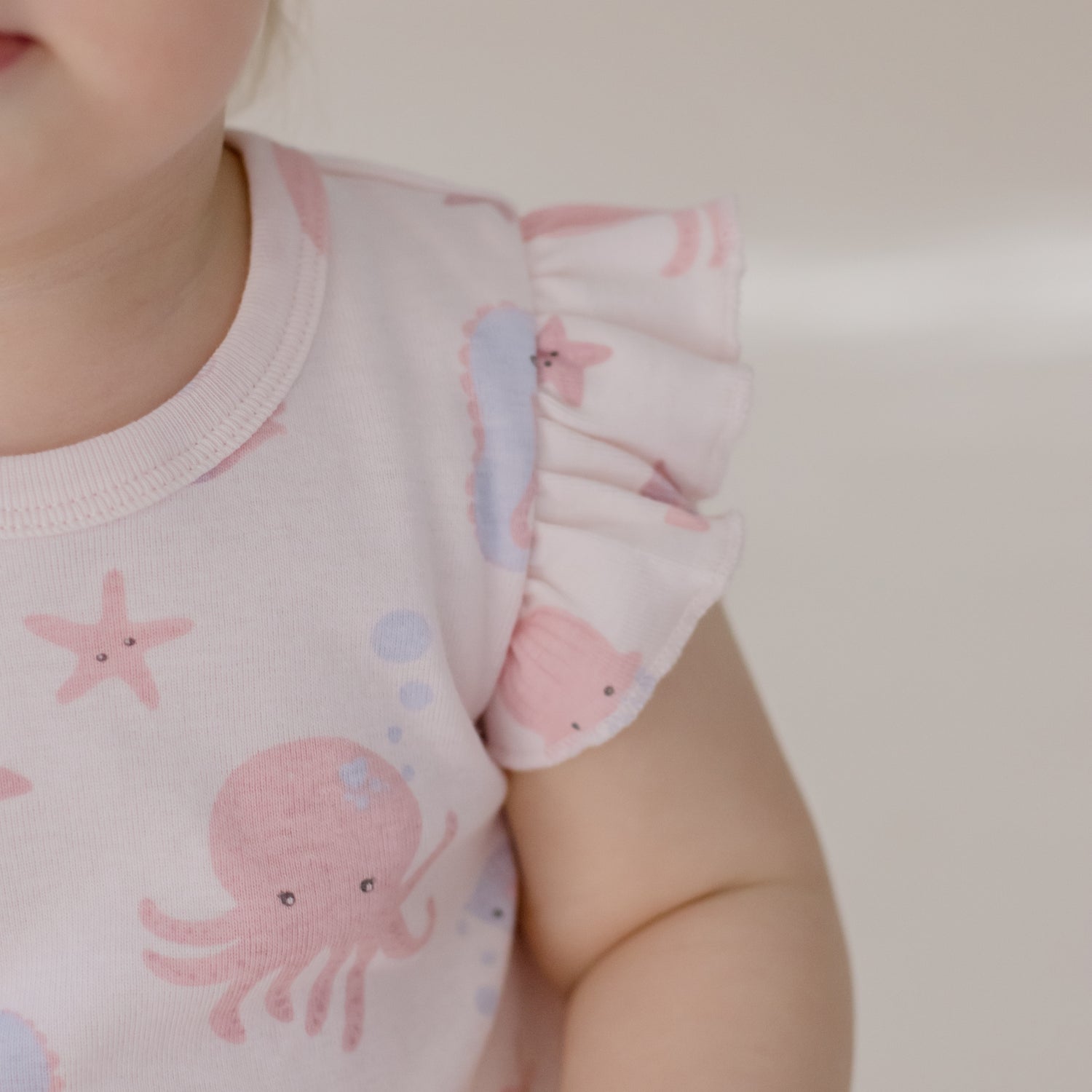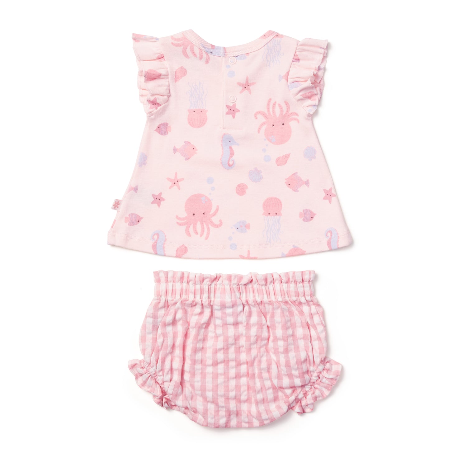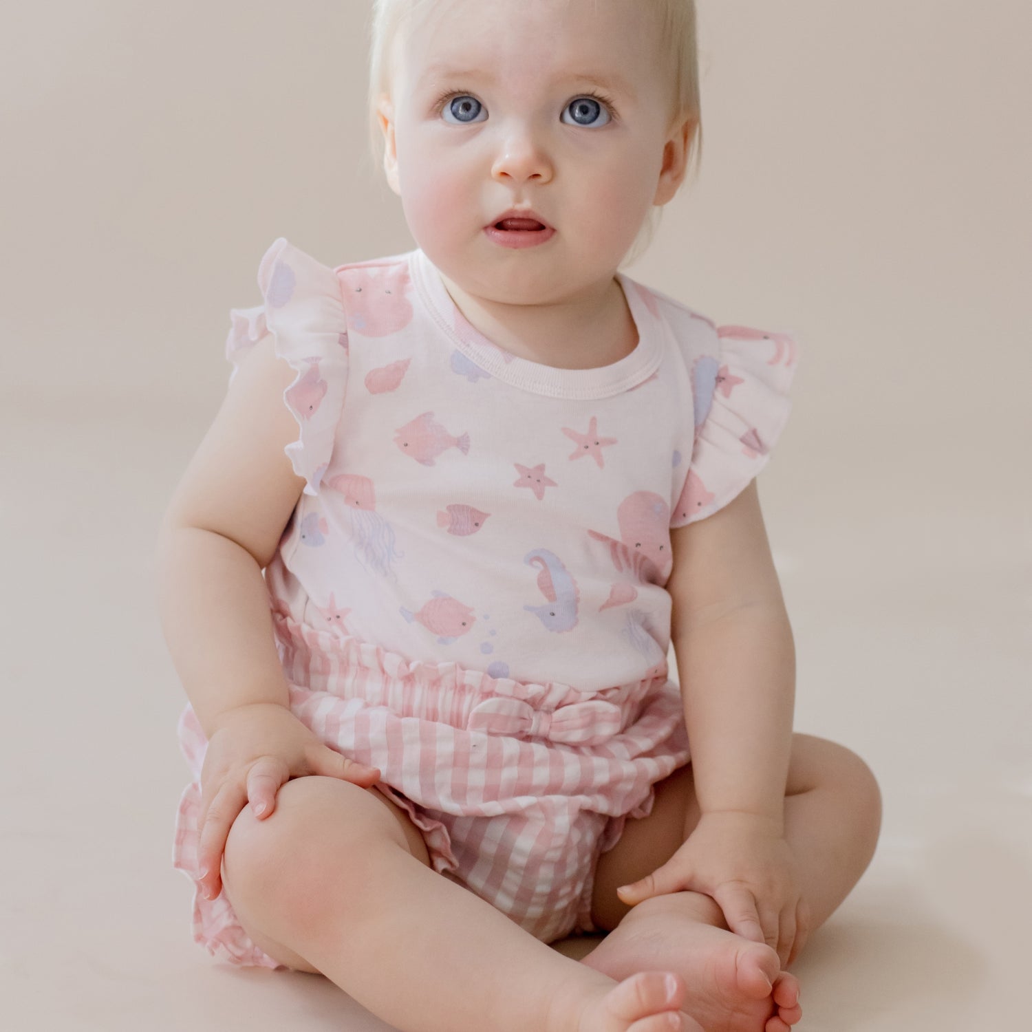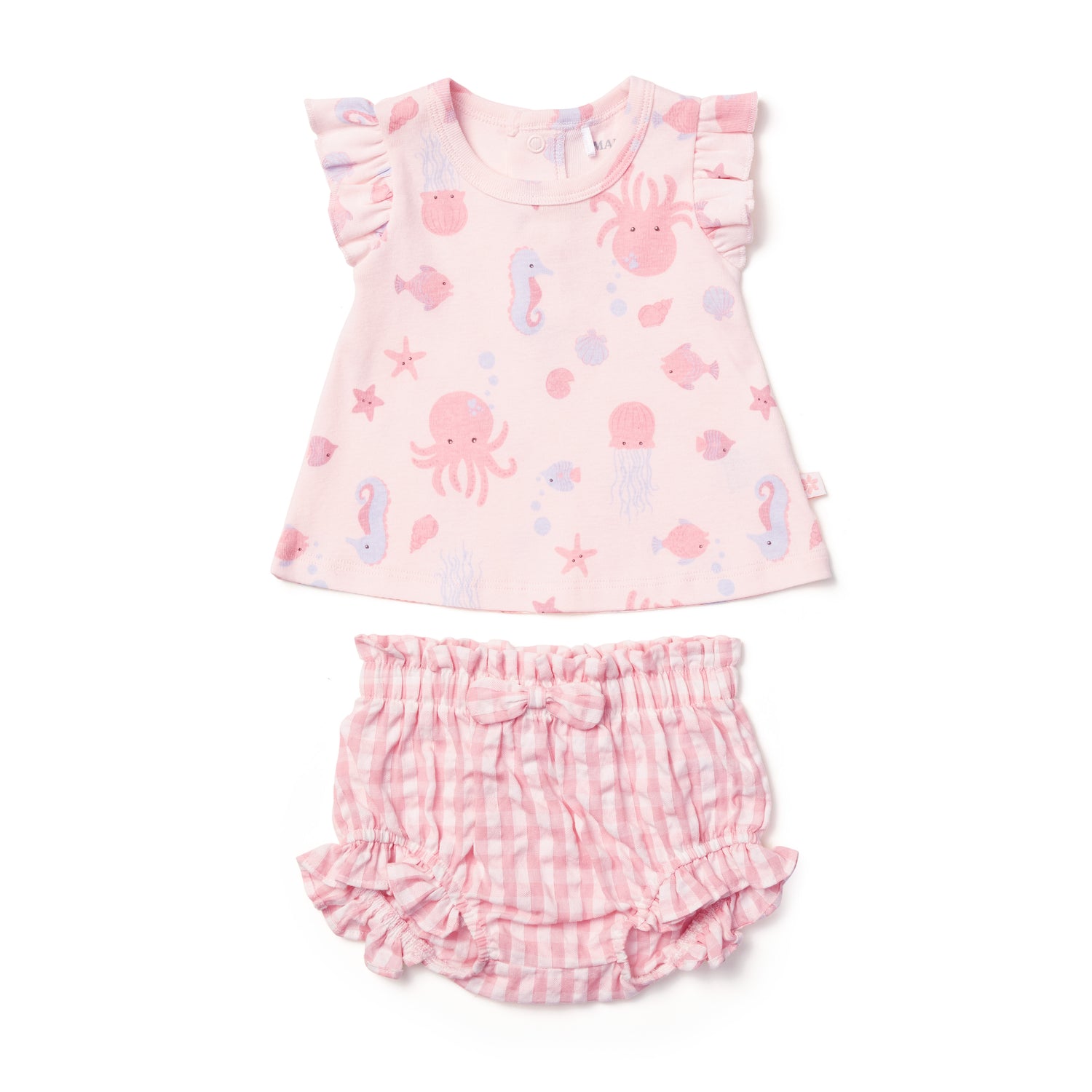 The Seascape Top & Woven Bloomer Set is a cheerful summer outfit full of charm and imagination. Featuring a sea-themed print and flutter sleeves, the top is perfectly matched with pink gingham bloomers adorned with frills and a sweet little bow. Made from lightweight 100% cotton for breezy, warm-weather wear.