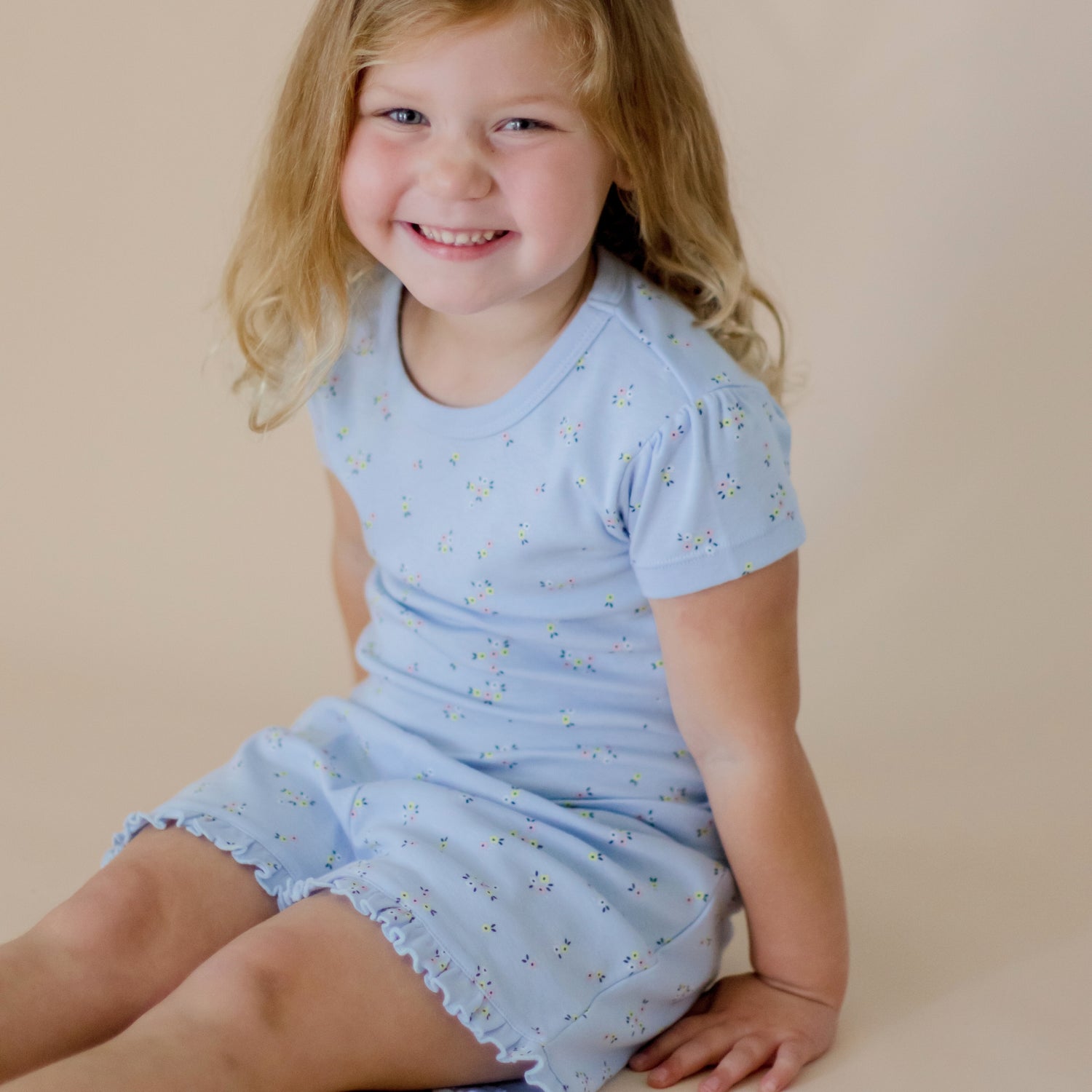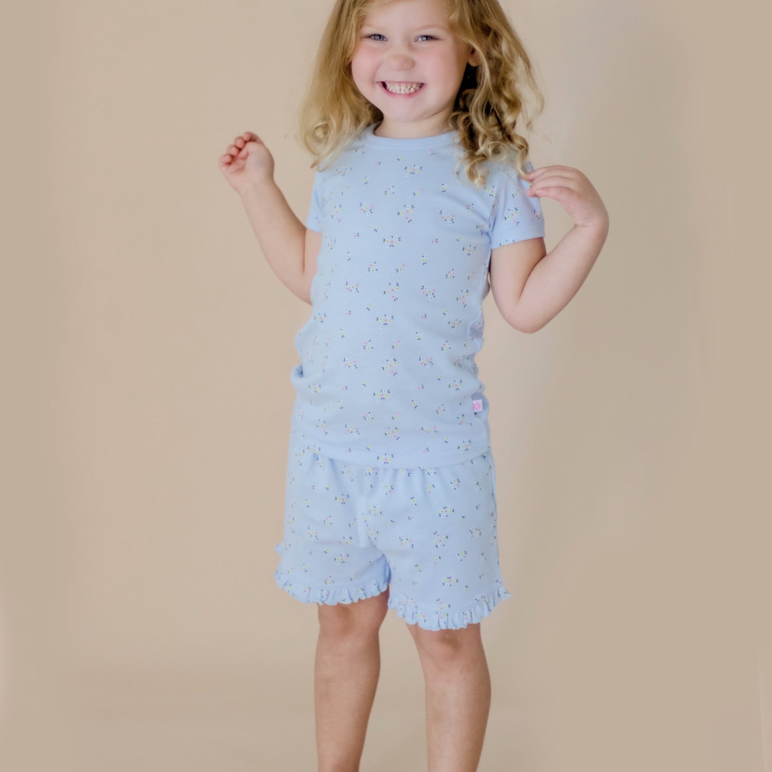 Designed for summer nights and sweet dreams, the Summer Petals Pyjama set in light blue features an all-over floral pattern and pretty frill trim on the shorts. Crafted from soft, breathable 100% cotton for all-night comfort and style.