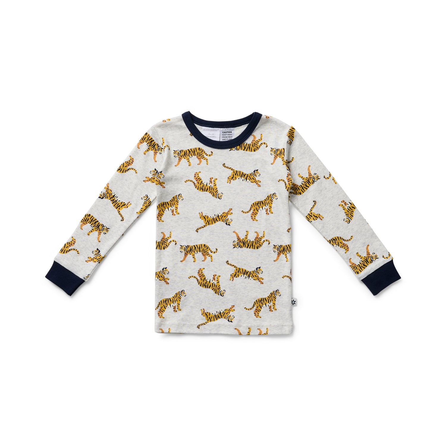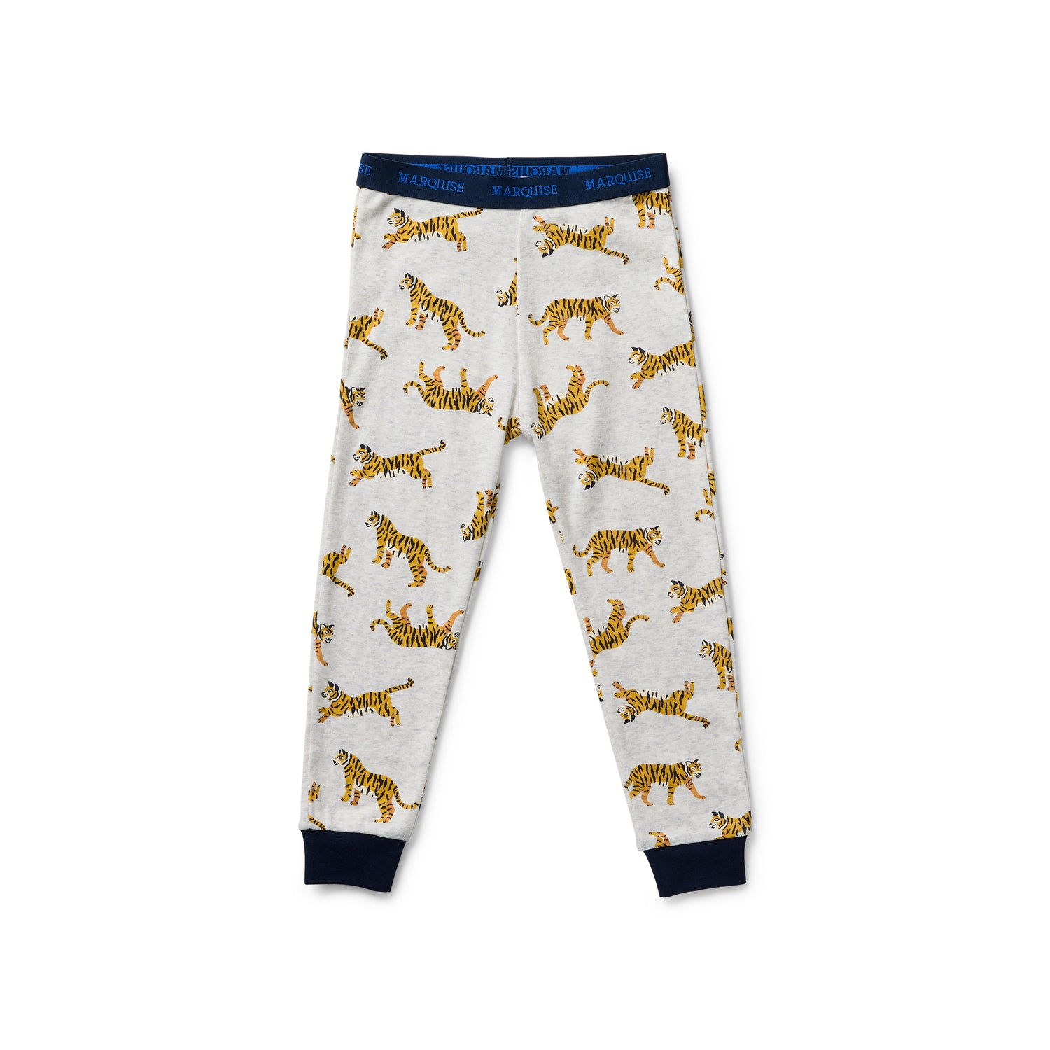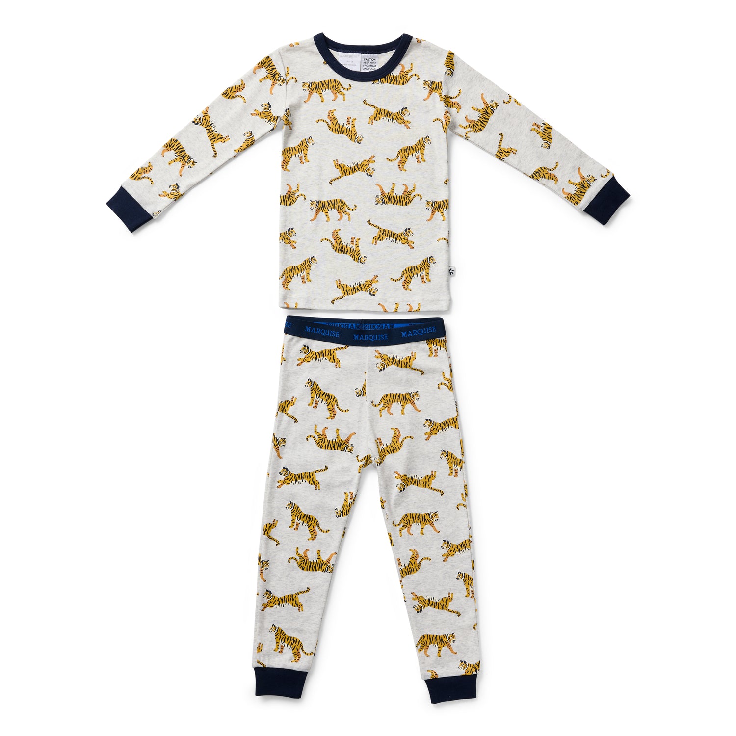 The Tiger Pyjamas are made from 100% soft cotton and features our playful tiger print on a grey melange base. Finished with a soft Marquise branded waistband and navy trims at the sleeves, legs and neckline.