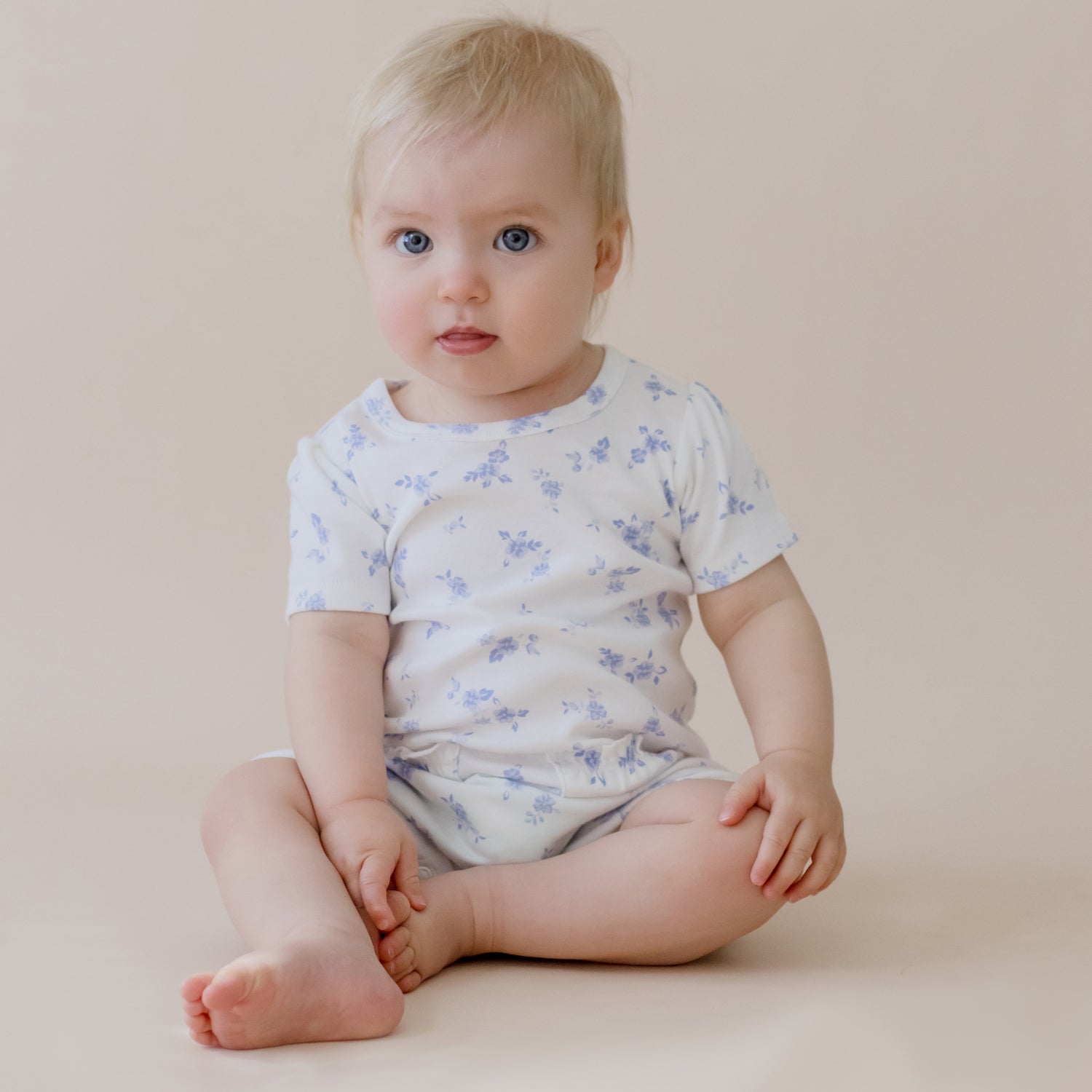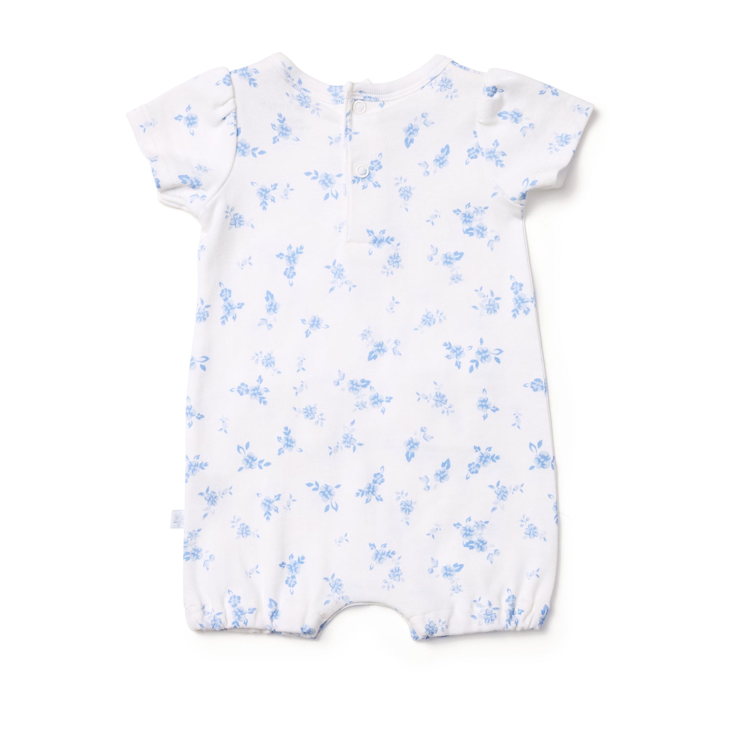 Sweet and timeless, the Seascape Floral Puff Sleeve Romper features a crisp white base with a delicate blue floral print. Puff sleeves and little pockets add charming detail, while press studs underneath make changes quick and simple. A lovely everyday piece with vintage-inspired flair.